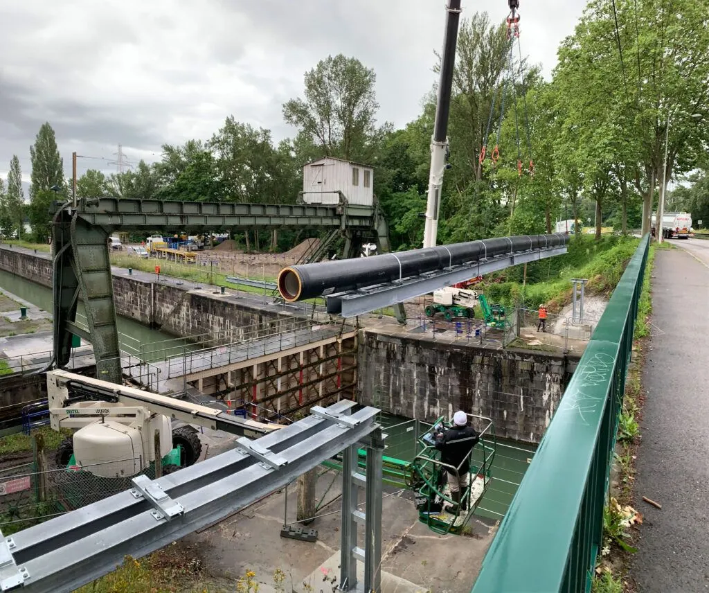 Dans le cadre de la création d’un nouveau poste de pompage assainissement, l’Eurométropole de Strasbourg (67) a renouvelée une conduite suspendue en DN 500, située à proximité de l’Ecluse Sud le long de la Darse du Rhin.